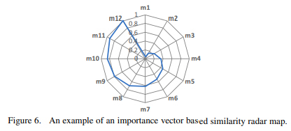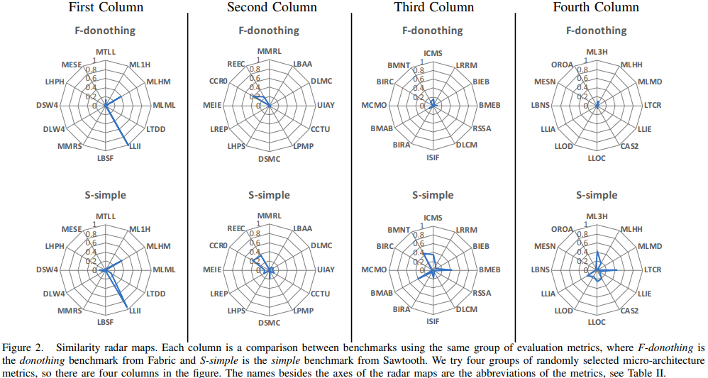 (정점 m1 - m10은 사건 이름이며, 그 값은 중심과 정점 사이에서 정규화된다. 레이더 맵의 정점 수는 중요도 벡터의 이벤트 수와 시각화의 편의성 모두에 의해 결정되고(섹션 V 참조). 다양한 벤치마크의 레이더 그래프 모양을 비교함으로써 서로 다른 벤치마크 간의 유사성을 편리하게 관찰할 수 있다. 다음으로 벤치마크 유사도 매트릭스를 정의한다. 이 매트릭스는 선택한 벤치마크의 유사도를 나타내며 시각화할 수 있다. 유사도 행렬은 두 개의 벤치마크를 나타내는 두 개의 중요도 벡터 사이의 유클리드 거리에 기초한다.)