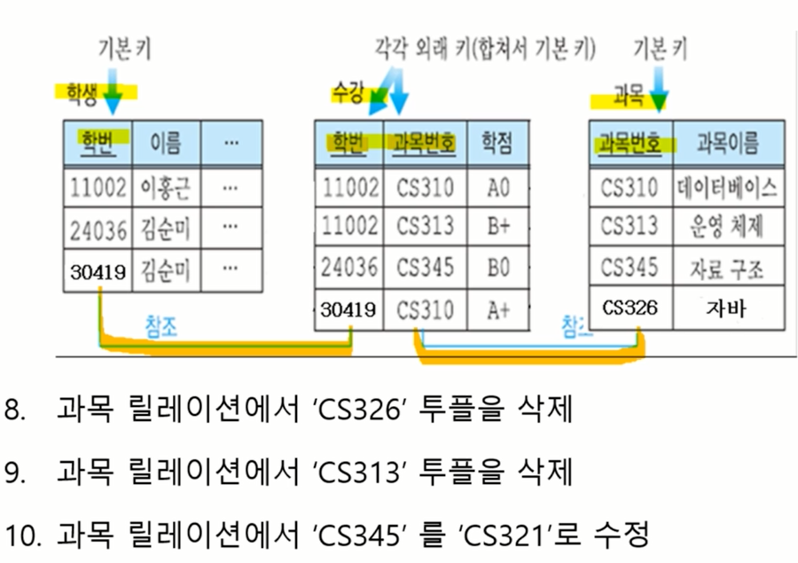 - 2. 연쇄(cascade) CS345를 CS321로 수정하고 참조하는 외래키가 있는 튜플에 가서 CS345를 CS321로 연쇄 수정한다.