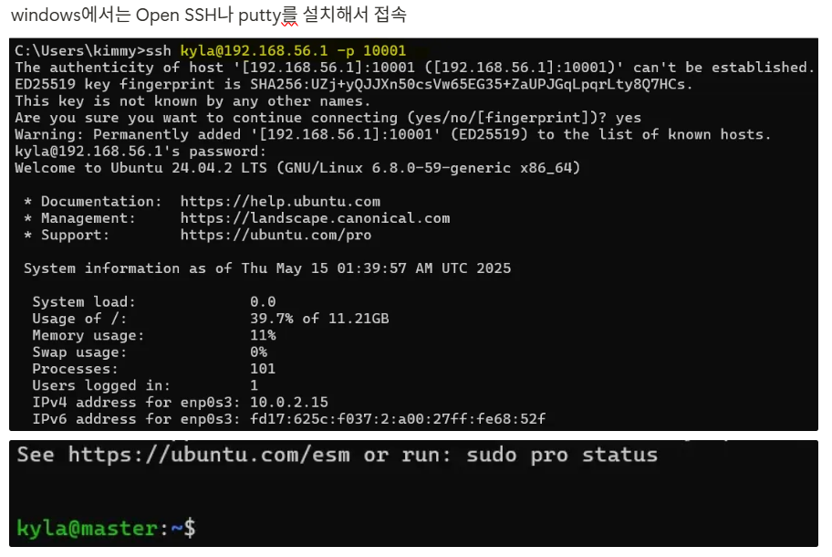 - 윈도우에서 실제 IP를 확인: ipconfig (IPv4 주소 . . . . . . . . . : 192.168.56.1)