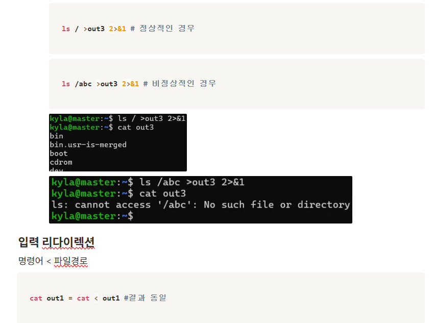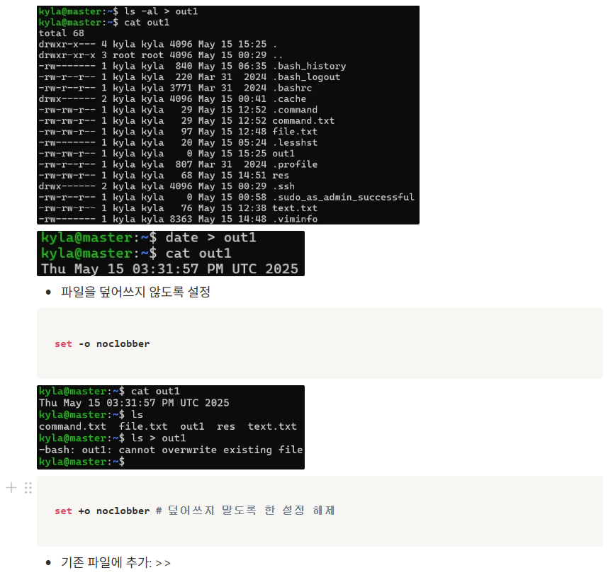 - date 명령의 결과를 out1에 기록 : date > out1 → 기존 내용이 지워지고 date 명령의 결과를 out1에 기록