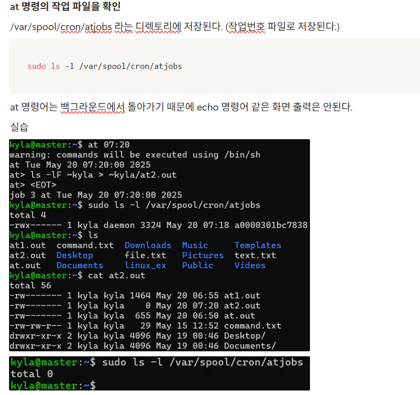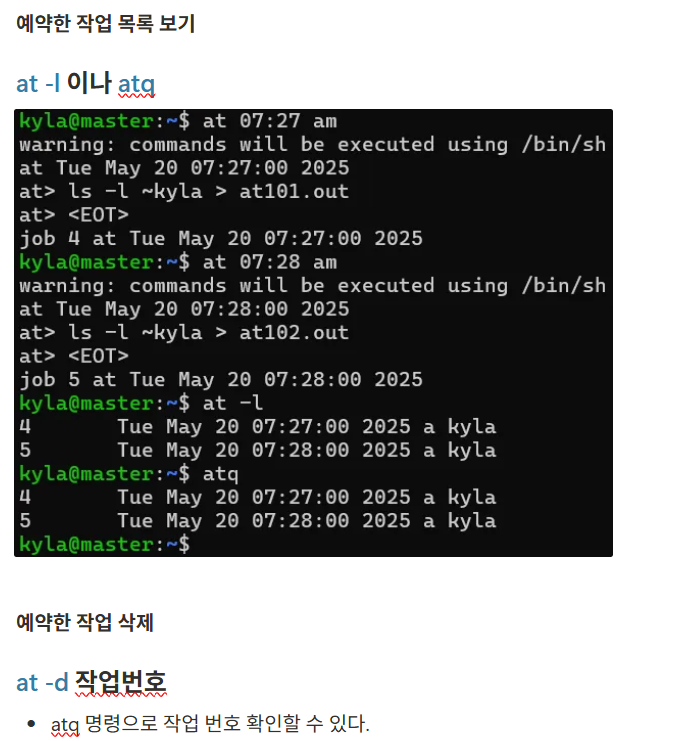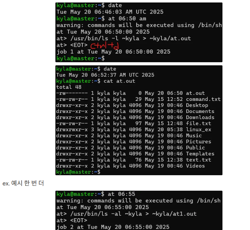 ex. 아침 6:50분에 사용자 kyla의 홈 디렉토리를 long format(-l 옵션)으로 나열하고, 그 결과를 kyla의 홈 디렉토리에 있는 at.out 파일로 출력