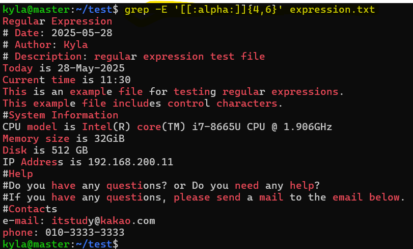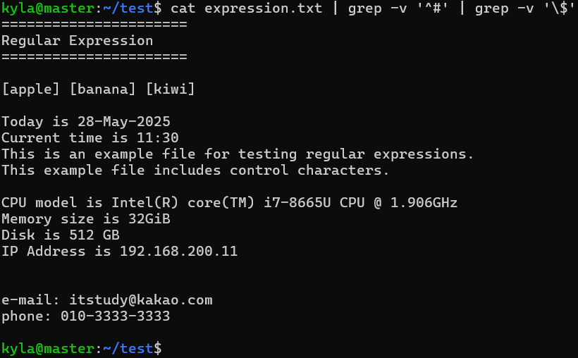 ====================== Regular Expression ====================== #=======================# # Date: 2025-05-28 # Author: Kyla # Description: regular expression test file # ======================# Today is 28-May-2025 Current time is 11:30 This is an example file for testing regular expressions. This example file includes control characters. #System Information CPU model is Intel(R) core(TM) i7-8665U CPU @ 1.906GHz Memory size is 32GiB Disk is 512 GB IP Address is 192.168.200.11 #Help #Do you have any questions? or Do you need any help? #If you have any questions, please send a mail to the email below. #Contacts e-mail: itstudy@kakao.com phone: 010-3333-3333
