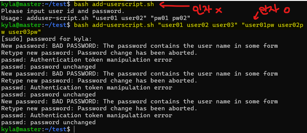 echo -e 'Please input user id and password.\\nUsage: adduser-script.sh "user01 user02" "pw01 pw02"'
