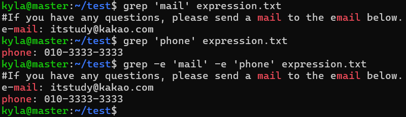 grep 'mail' expression.txt grep 'phone' expression.txt grep -e 'mail' -e 'phone' expression.txt