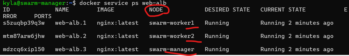 - docker service ps web-alb 로 확인 가능