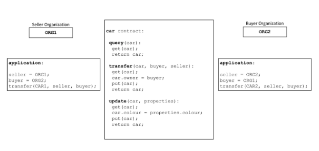 - 서로 다른 조직간의 규칙을 정의하고 애플리케이션에서 스마트 컨트랙트를 호출하는 트랜잭션을 요청하여 그 결과를 원장에 기록한다.