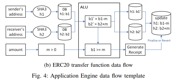 - Two input units will read the 160-bits receiver’s address and sender’s address respectively, and then calculate the corresponding keccak256 hash value. The other input unit will read the transaction data field and get the amount of tokens to be transferred. The ALU will calculate the output value. The Assertion unit is used to revert the execution by discarding the current state changes, if specific conditions do not meet.
