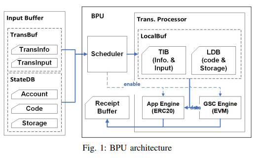 - BPU will read data from Input Buffer via a Scheduler, process the transactions in the Transaction Processor (TP), and finally write the result to the Receipt Buffer.