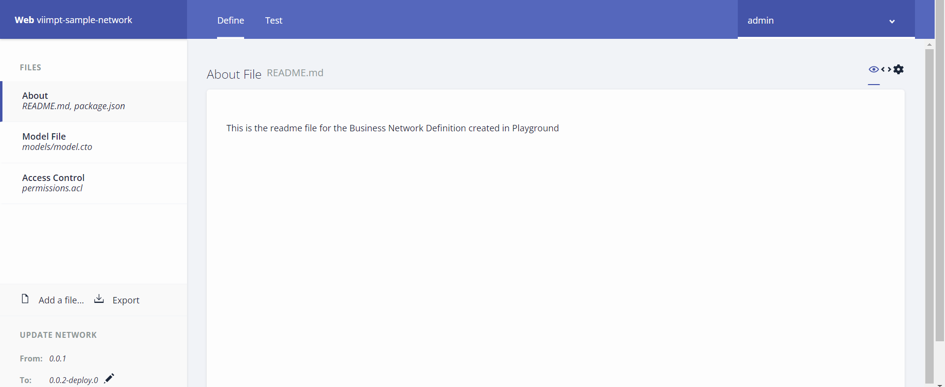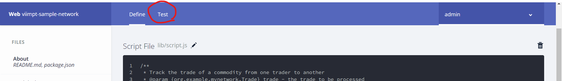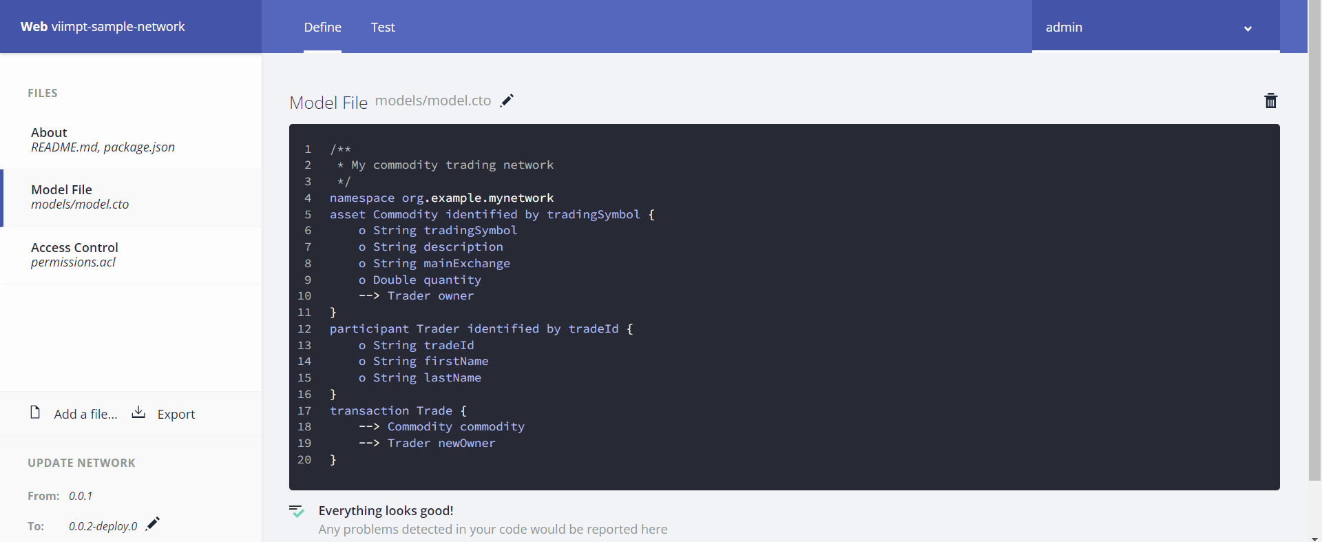 이제 모델, 스크립트 및 액세스 제어 파일이 있으므로 비즈니스 네트워크를 구축하고 테스트해야 한다. Deploy changes를 클릭하여 비즈니스 네트워크를 업그레이드 한다.