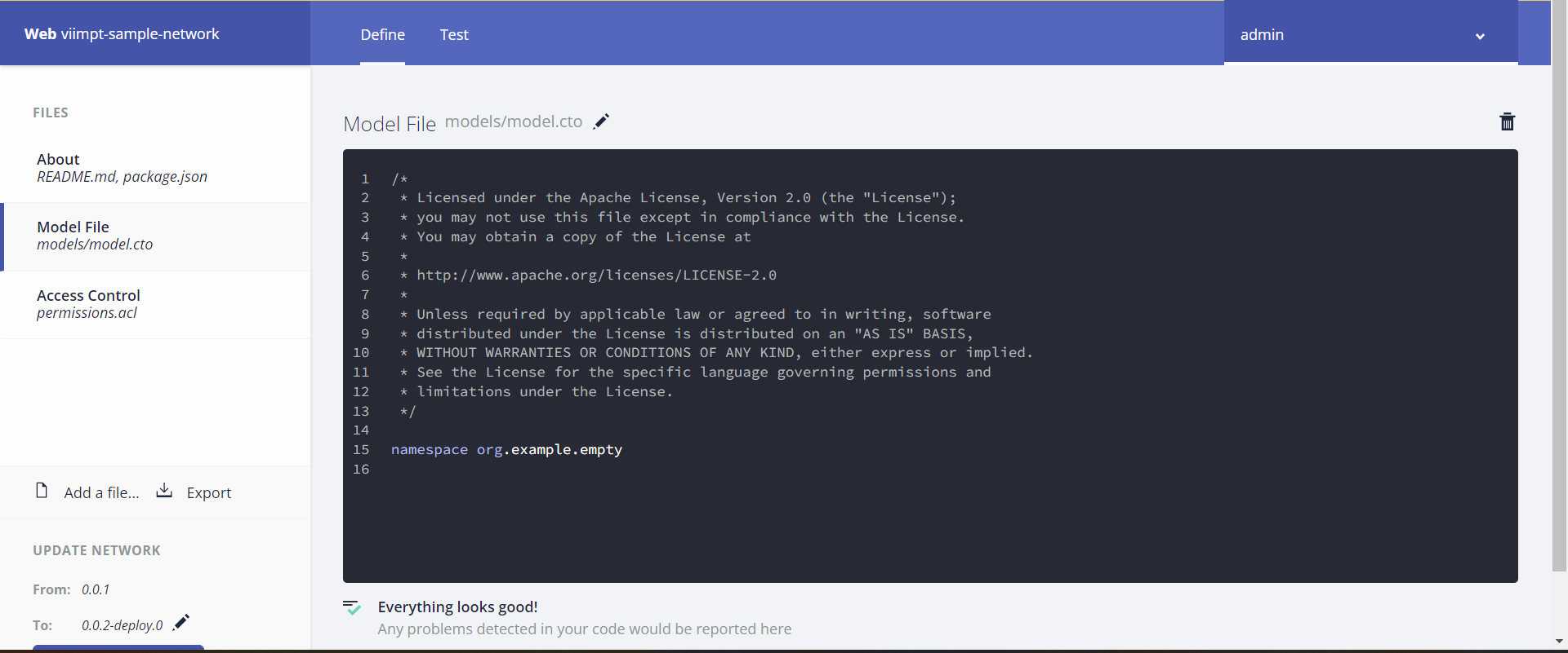 액세스 제어 파일은 비즈니스 네트워크에 대한 액세스 제어 규칙을 정의한다. 네트워크가 간단하므로 기본 액세스 제어 파일을 편집할 필요가 없고 기본 파일은 현재 참여자 네트워크 관리자에게 비즈니스 네트워크 및 시스템 수준 작업에 대한 전체 액세스 권한을 부여한다.