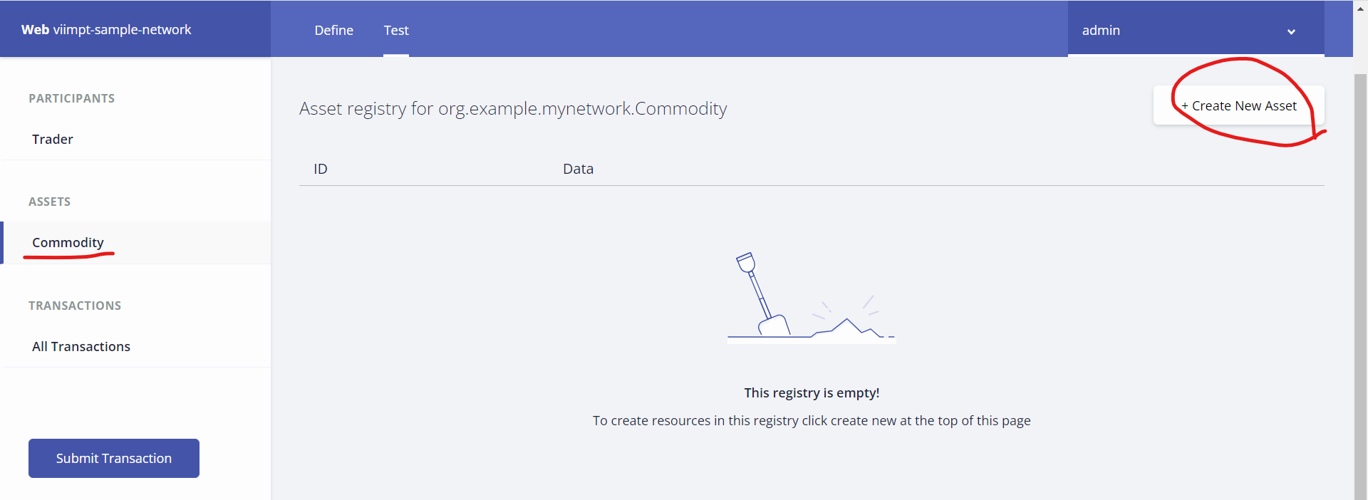 7. Test 탭을 클릭해 상품의 소유권을 변경하기 위해 비즈니스 네트워크를 테스트 한다.