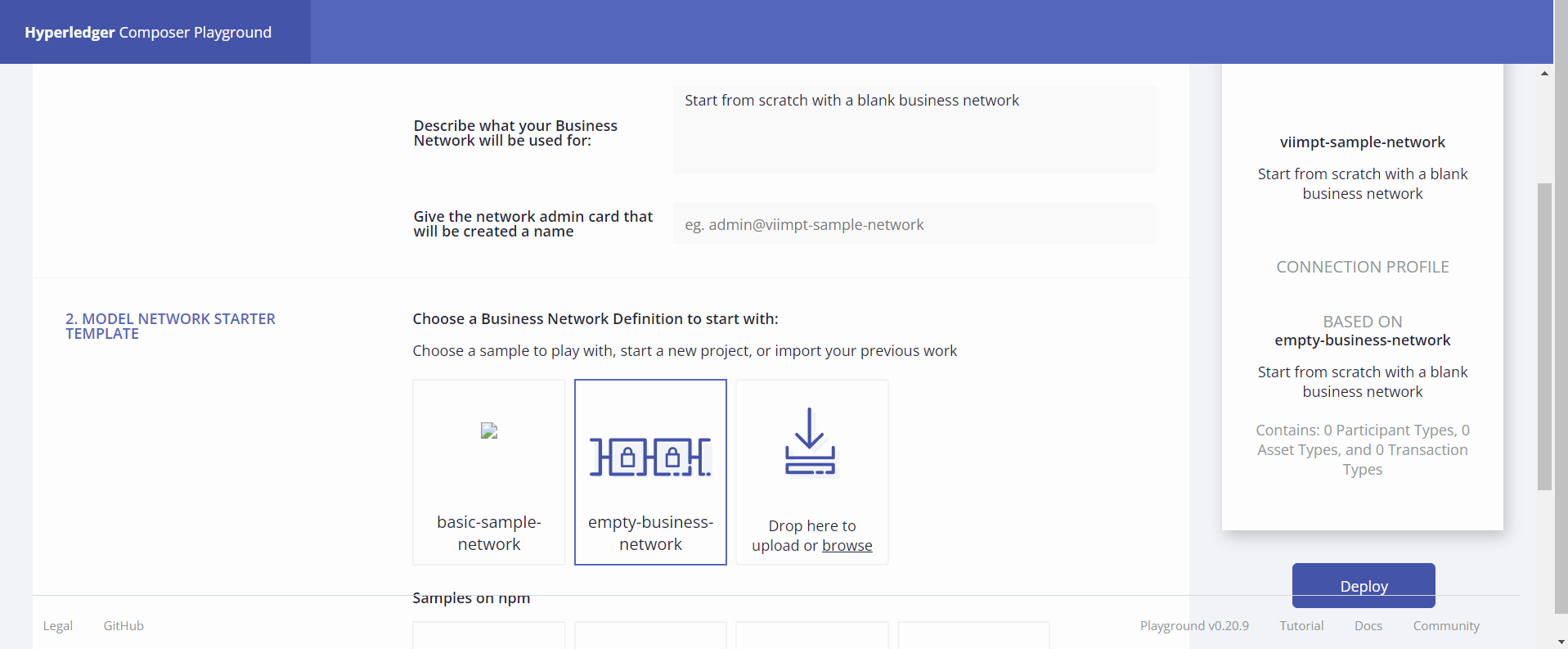 네트워크를 처음부터 구축하려면 비즈니스 네트워크를 선택해야 하기 때문에 빈 비즈니스 네트워크를 클릭한 후 Deploy를 누른다.