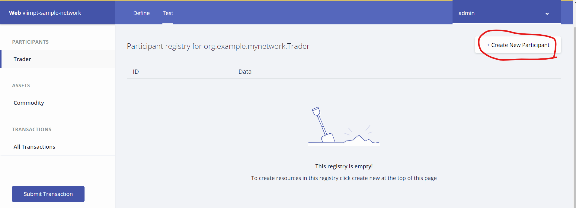 8. 비즈니스 네트워크에 가장 먼저 추가해야 할 것은 두 명의 참가자이므로 Create New Participant를 눌러 참가자를 생성한다.
